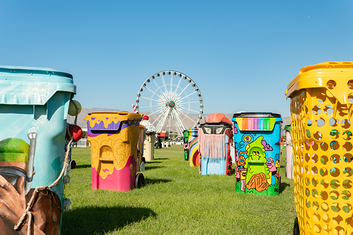 The TRASHed (Trash Education) Art of Recycling program is one of Global Inheritance's longest-running programs at Coachella, with over 2,000 recycling bins designed since 2004.