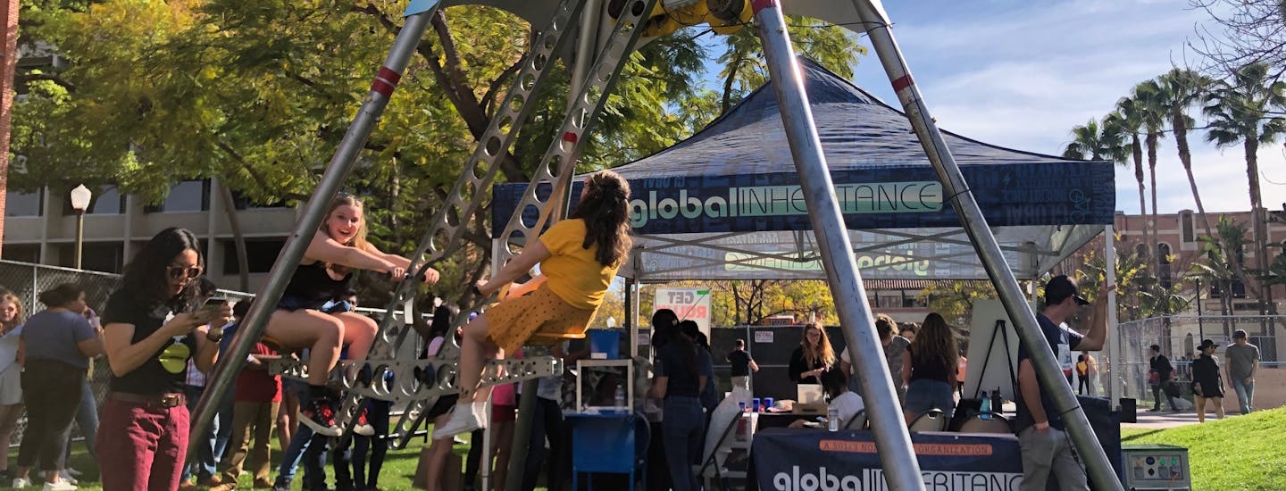 Go backThis past weekend, USC's Springfest was full of energy thanks to our Energy Playground + a powerful USC student body. While students took a break from the music, they could charge their phones by producing their own energy on our Energy See-Saws, Energy SwingSet, and Human Hamster Wheel! Every student who gave us at least 3 minutes of energyenjoyed an off the gridsnow cone!First launched in 2007, our Energy Playground offers participants the chance to play like a kid again, all while powering musical equipment, snow cone machines, outdoor movies, and everyday devices. The Energy Playground allows people to see - and feel - the impact that they can have on energy production. You can catch our energy playground next at Coachella 2019.
