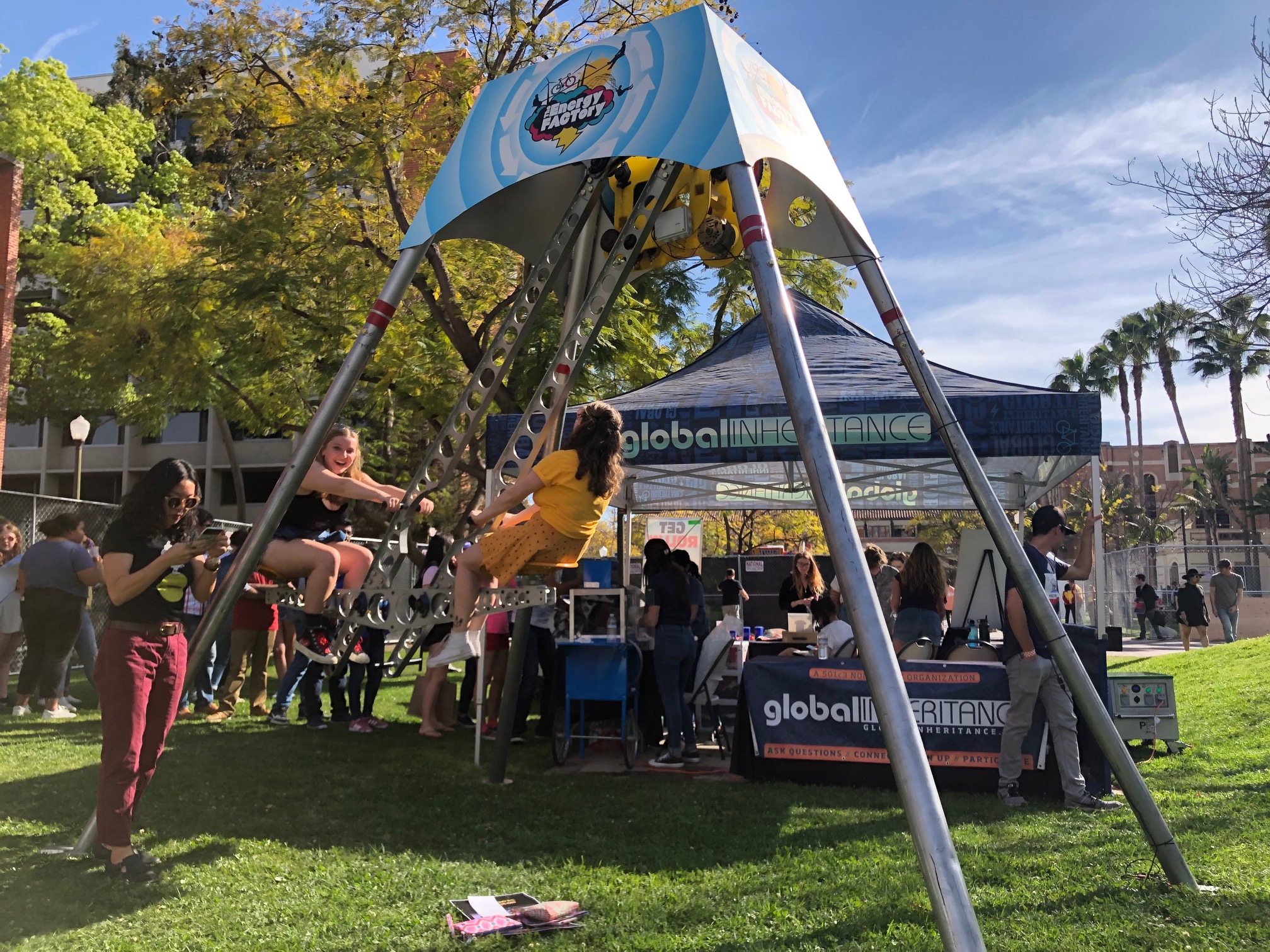 Go backThis past weekend, USC's Springfest was full of energy thanks to our Energy Playground + a powerful USC student body. While students took a break from the music, they could charge their phones by producing their own energy on our Energy See-Saws, Energy SwingSet, and Human Hamster Wheel! Every student who gave us at least 3 minutes of energyenjoyed an off the gridsnow cone!First launched in 2007, our Energy Playground offers participants the chance to play like a kid again, all while powering musical equipment, snow cone machines, outdoor movies, and everyday devices. The Energy Playground allows people to see - and feel - the impact that they can have on energy production. You can catch our energy playground next at Coachella 2019.